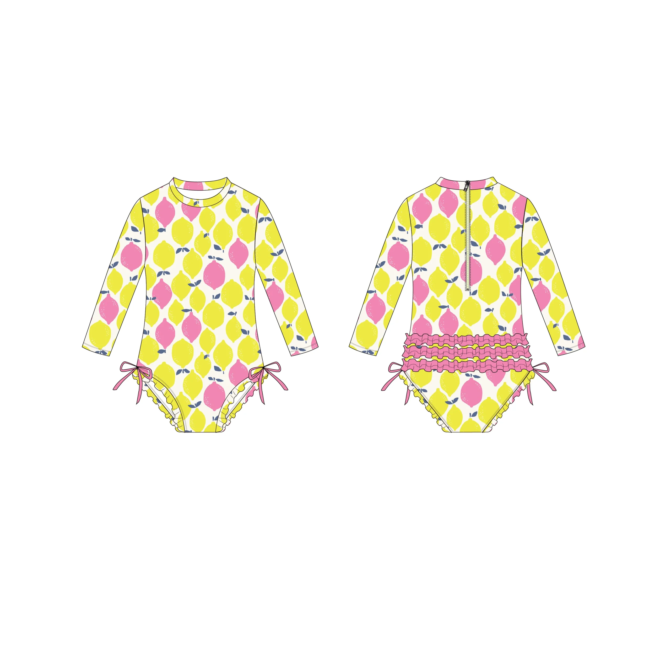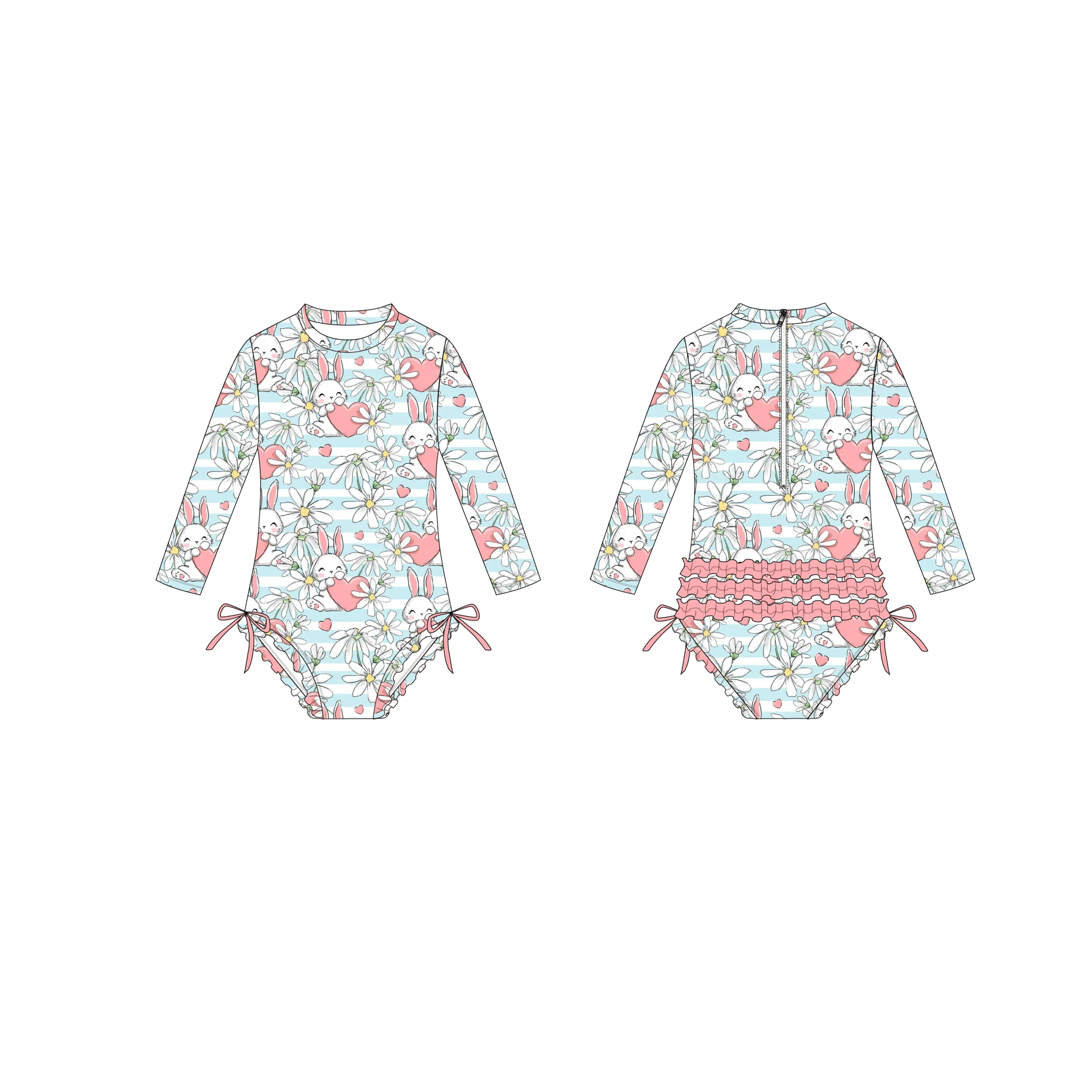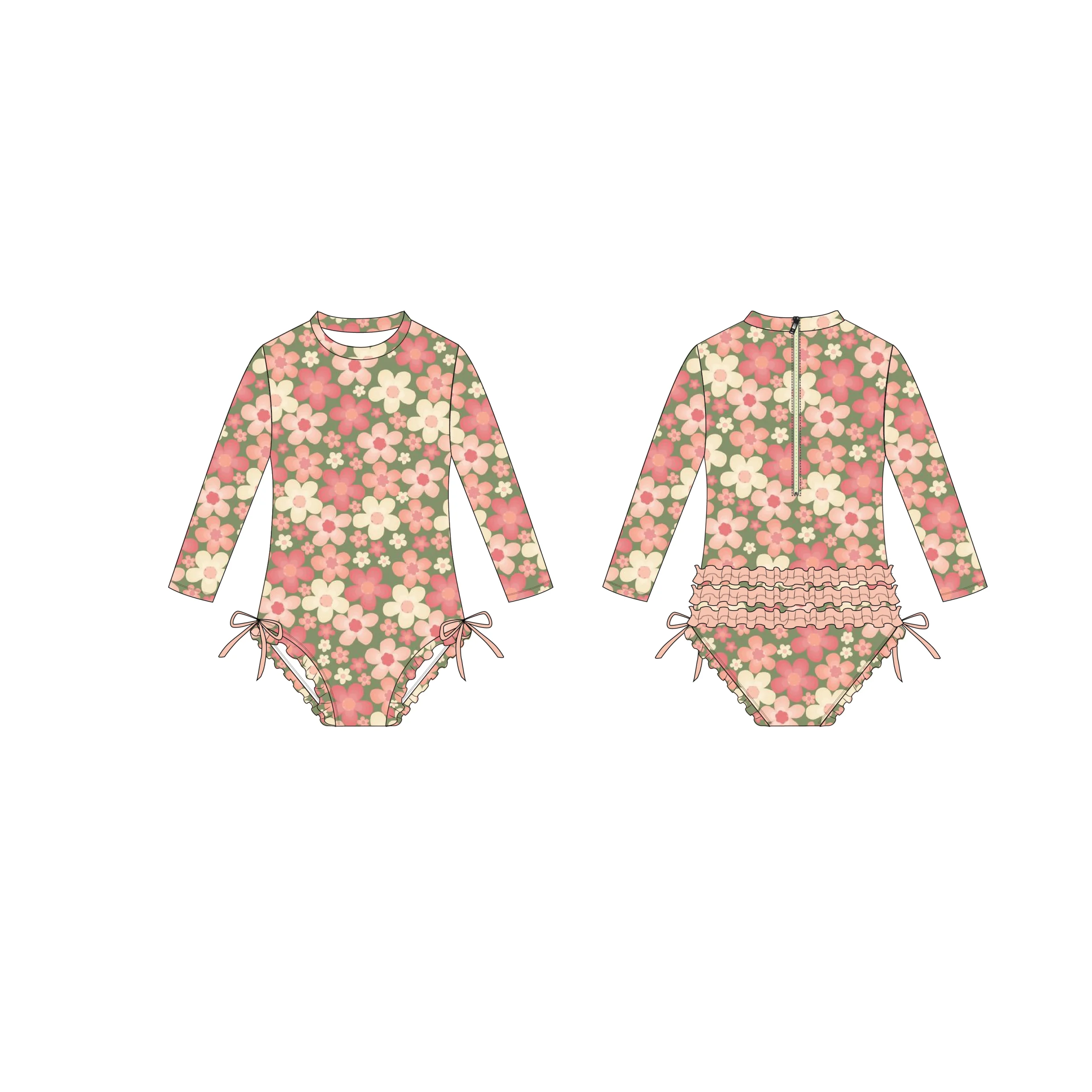 Custom Girls Bathing Suit Recycled Kids Sun Protectant UPF50+ Fabric Bikini Long Sleeves Swimwear Signature Rear Ruffles