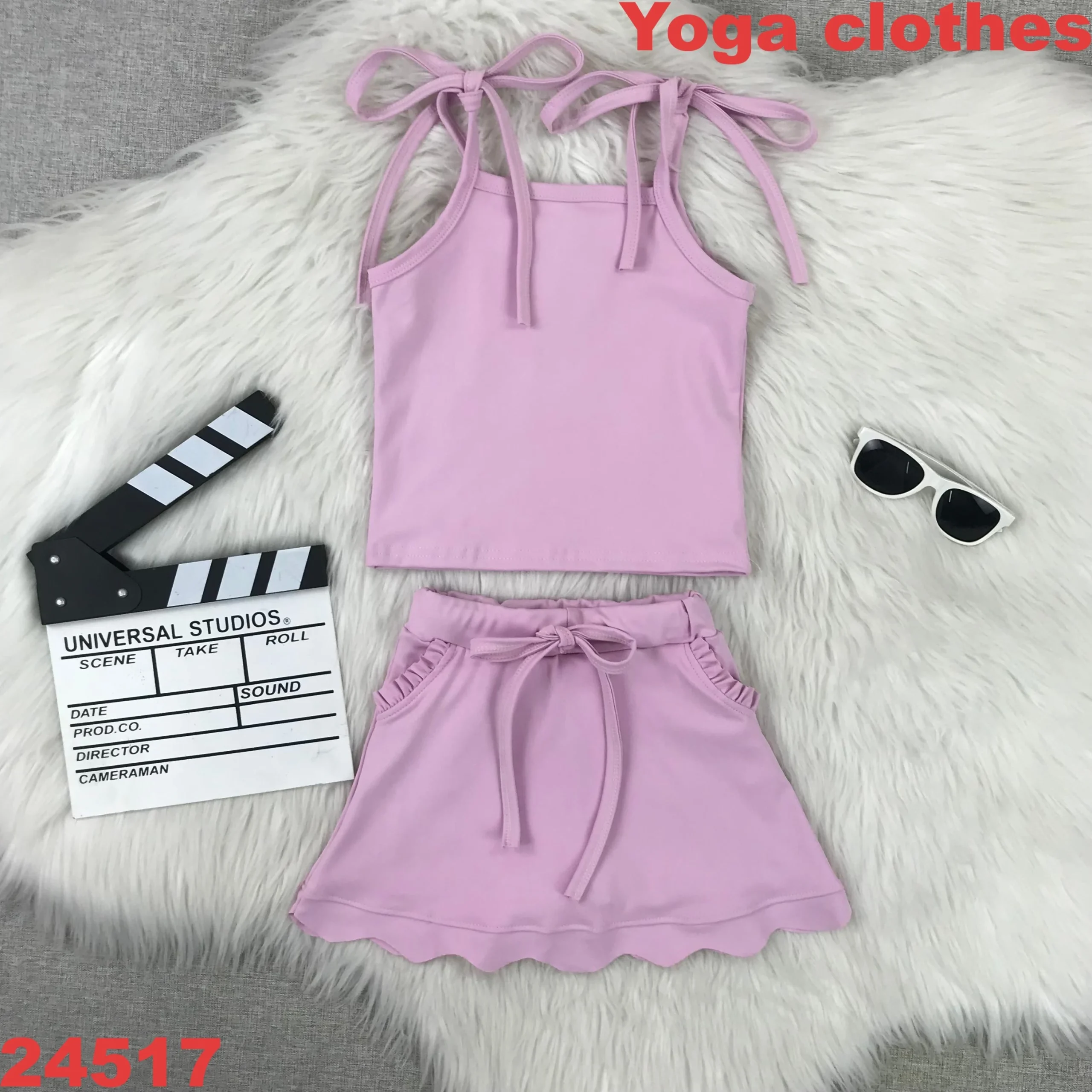 Customizable Child Kids Girls Yoga Clothing Sets ODM Embroidered Logo Low MOQ Solid Pattern Spaghetti Strap Top Skirt
