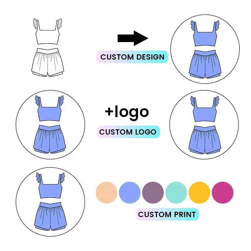 Kerui Active Wear Kids Girls Yoga Crop Set Sleeveless Ruffle Trim Elastic Tank Double Layer Shorts Custom Print Sports Suits