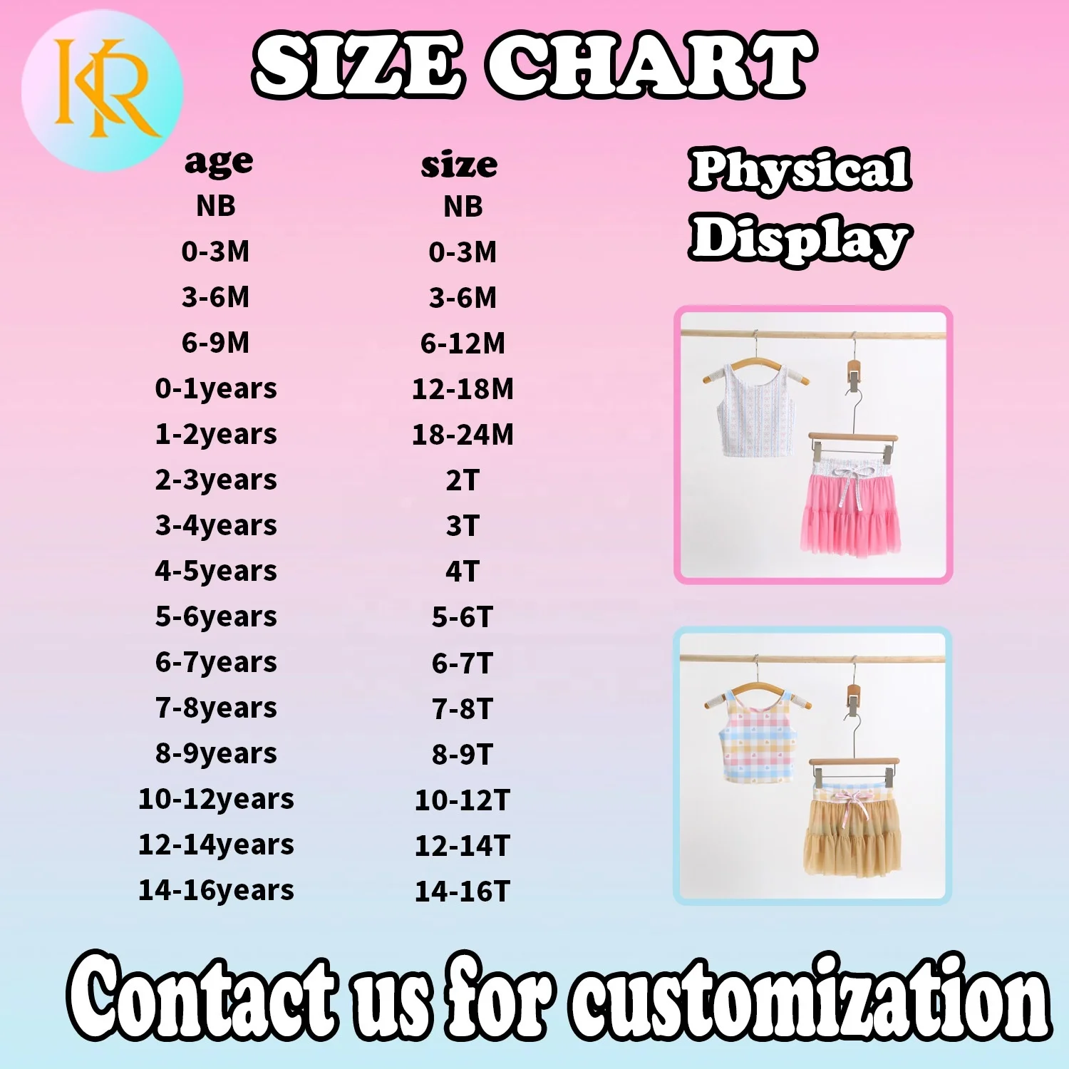 | Size | S, M, L, Xl, 6-12M, 12-18M, 18-24M, 2T, 3T, 4T, 5-6T, 7-8T, 9-10T, 10-12T, 12-14T, 16T |