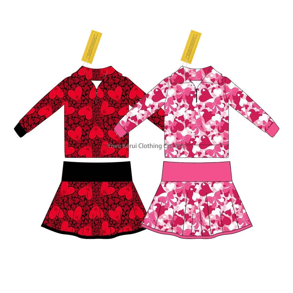 Kerui Autumn Wholesale Children’s Formal Activewear Girl Clothing Sets with Red Hearts Print Top and Skirt