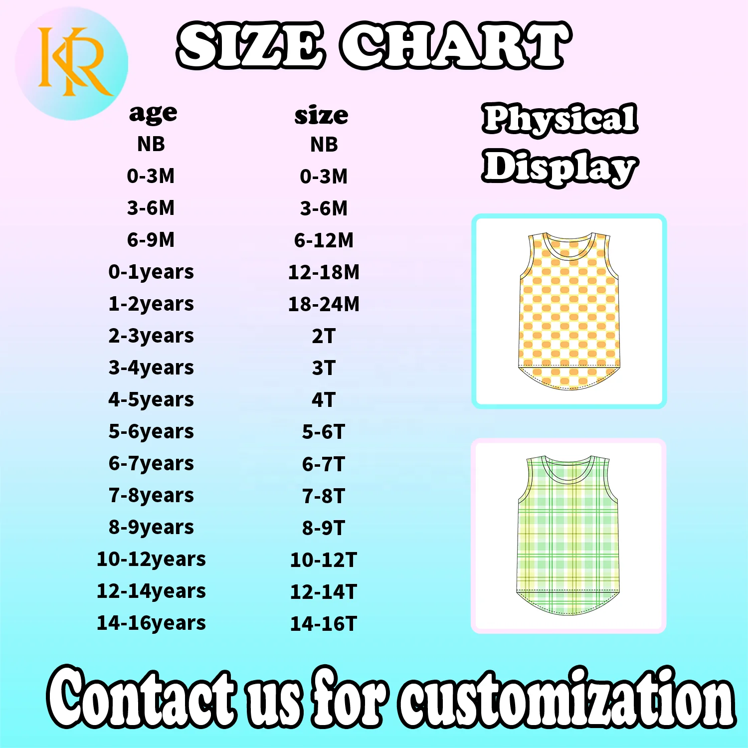 | Age | 3-6m, 6-12m, 12-18m, 18-24m, 2T, 3T, 4T, 5/6, 7/8, 9/10, 10/12, 12/14, 16T |