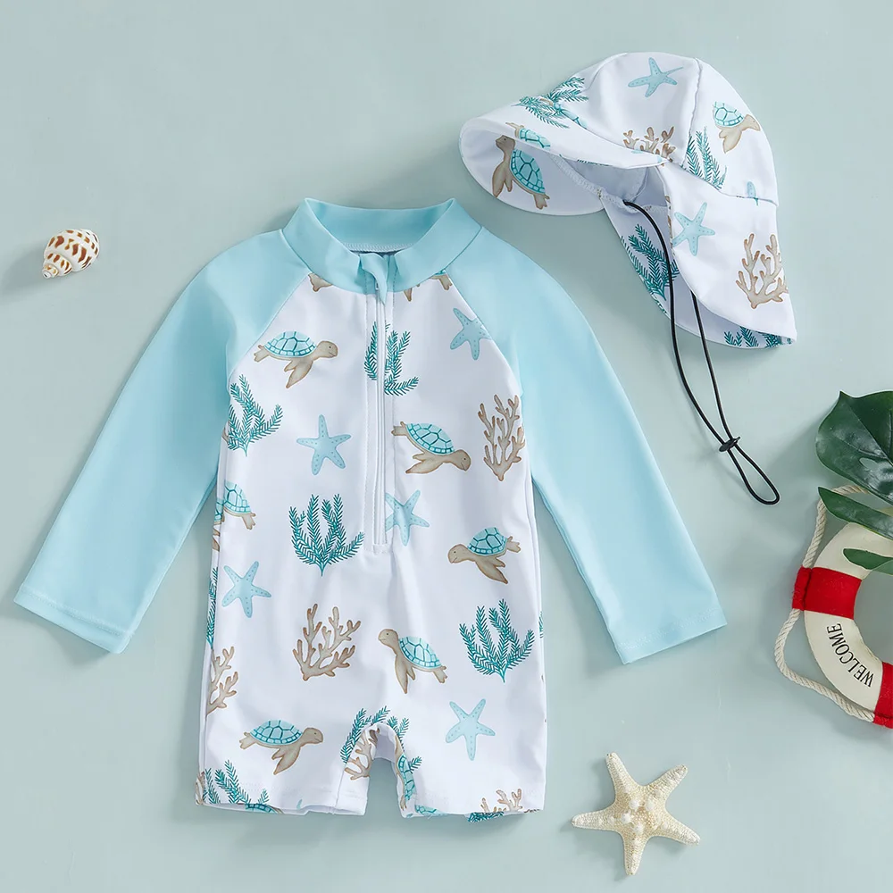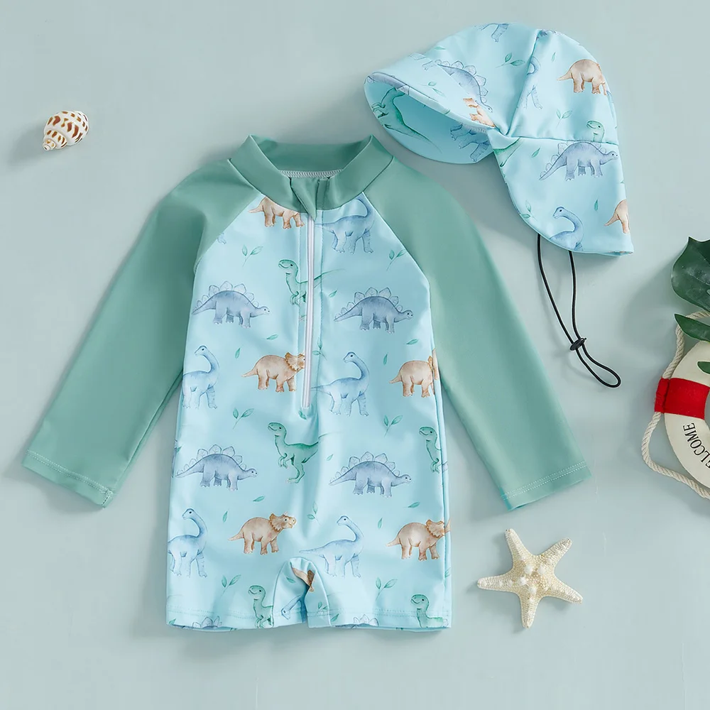 OEKO TEX Animal Print Baby Swimwear Custom Children Swimsuit UV50 One Piece Beach Wear Girls Bathing Suit With Sun Hat