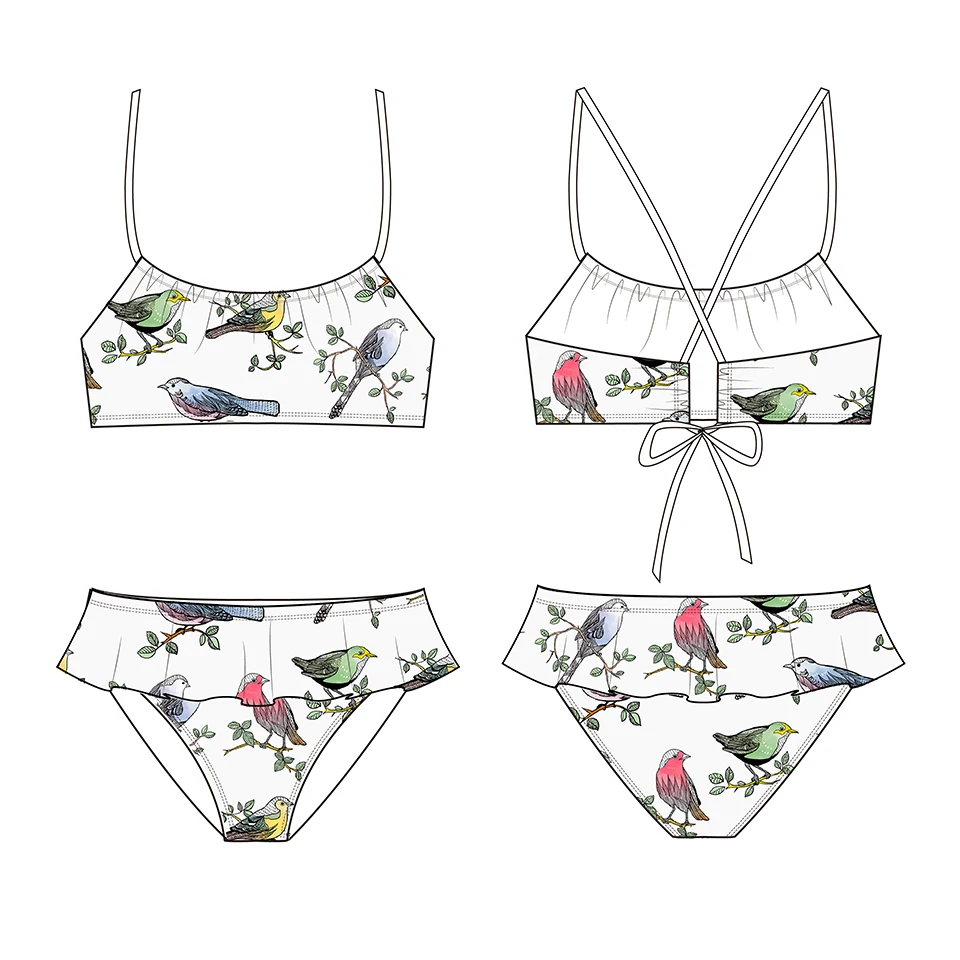 OEKO TEX Casual Girls Bikini Set Two-Piece Swimsuit with Floral Bird Print ODM Swimwear for Children for Beach Use