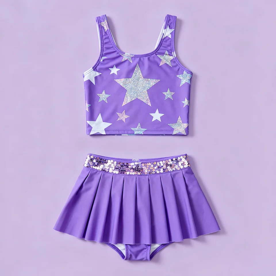 OEKO TEX Certified Girls Children’s Two-Piece Swimwear Print UV Protection Breathable Fabric-Ruffle Cross Shoulder Straps